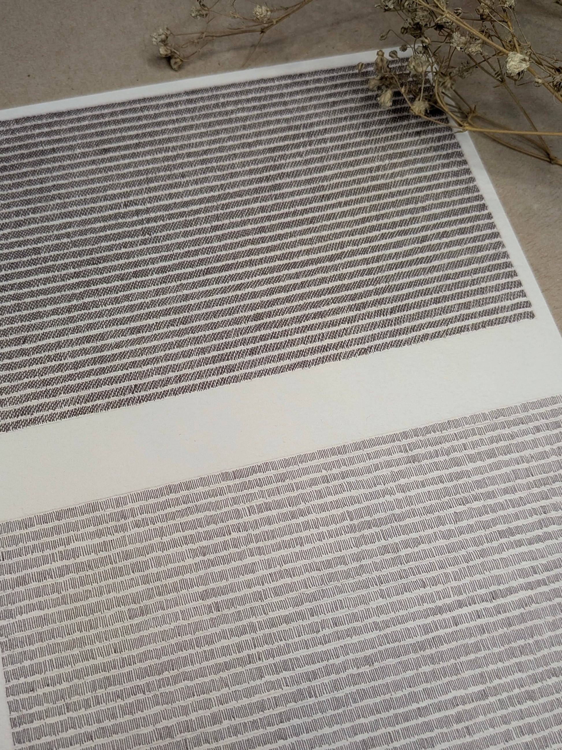 A hand-drawn abstract artwork created from hundreds of tiny lines arranged in a dense pattern. Drawn with Sakura fine-liners on 300gsm watercolour paper, this minimalist geometric piece explores repetition and texture.